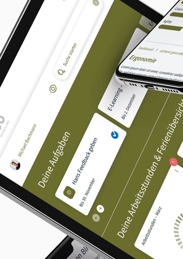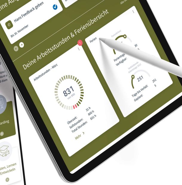 Im Zentrum des Mitarbeiter-Cockpits sind die Kennzahlen, die wirklich interessieren: das sind der Ferien- und der Überstundensaldo. Und ganz nah platziert ist auch die Aufforderung, die Ferien zu planen und die eigenen Arbeitsstunden zu managen.